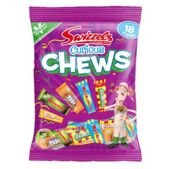 Chewy Sweet Delights: Dive into Swizzels Curious Chew Sweets mixed bag featuring 18 individually wrapped vegan chewy sweet treats. From Drumsticks to Sour Refreshers, enjoy a guilt-free indulgence thats free from artificial colours.