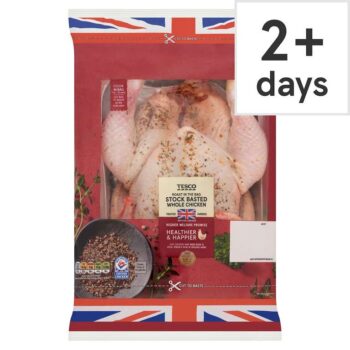 Cook up an easy roast any day of the week. Our roast in the bag whole chicken is oven ready and seals in flavour for perfect results. This succulent centrepiece is seasoned with thyme and parsley and basted in chicken stock for a flavoursome, hassle free family meal. Just place in the oven and follow the simple cooking instructions. For a crispy skin, baste with the cooking juices after opening the bag. Return to the oven and cook for a further 5 to 10 minutes. Serve with tasty trimmings like our Sticky Chantenay carrots and parsnips recipe. Click the Recipes tab at the top of this page to find our side dish recipes. From trusted farms. Our chickens are reared by selected farmers in spacious barns with daylight and bales to encourage natural behaviours and ensure their wellbeing. All of our fresh chicken is 100% British and is reared to a higher welfare standard. We provide 20% more space than the industry standard, allowing the chickens to perch, peck, and play. For more information about our animal welfare standards visit tescoplc.com/susure