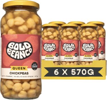 Giant tender chickpeas: slowly cooked to sumptuous perfection. Giant, tender and juicy, these slow-cooked garbanzo beans are Bold Bean Cos bestselling product. These Queen Chickpeas are specially selected from the best possible climate. Perfect for vegans, foodies and the health-conscious consumer, try them in a creamy, coconut curry or a coronation chickpea sandwich. Always free from additives or preservatives.