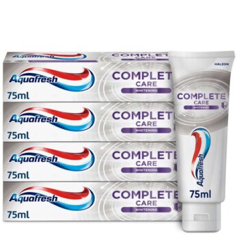 PROTECTS YOUR TEETH & CLEANS YOUR WHOLE MOUTH, TOO: Aquafresh Complete Care Whitening fluoride toothpaste delivers fresh breath, whiter teeth and a crystal clear feeling of cleanness. FIGHTS AGAINST: cavities, plaque at the gum line, bacteria, stains, bad breath, acid attack and enamel erosion. HELPS RESTORE TEETHâ€TMS NATURAL WHITENESS: Aquafresh Complete Care Whitening fluoride toothpaste gently removes stains to help restore your teeth to their natural whiteness. STRENGTHENS ENAMEL: Aquafresh Complete Care Whitening fluoride toothpaste fights bad breath and strengthens enamel even after you stop brushing. ADVANCE TRIPLE PROTECTION in a fresh minty flavour the family will enjoy. with twice daily brushing. compared to using standard fluoride Aquafresh toothpaste.