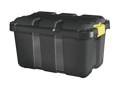 The Form Skyda Heavy Duty Black 49L Plastic Wheeled Storage Trunk with Lid is designed for durable outdoor storage.