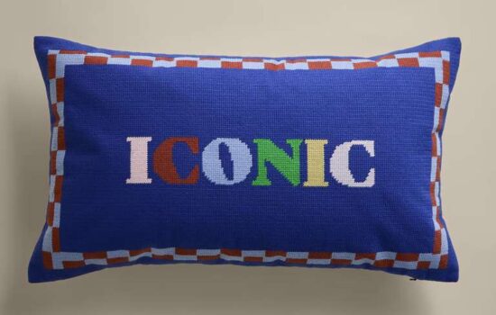 The Iconic Slogan Needlepoint Bolster Cushion is a decorative cushion designed to add a touch of style to any room.