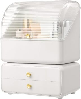 Upgraded 2-in-1 Design Size: 272835.8cm. Space-saving Beauty Organiser can split into a makeup storage box and a Cosmetic Storage unit with 2 drawers, large capacity design can stores 50 makeup items (eyeshadow palettes to lipsticks), 2 drawers can organize socks, ties or jewellery, makeup,essentials. Transform your vanity or dressing table with our innovative split-system makeup storage organiser. Multi-Functional Organiser Case Skincare / make up organiser box can sto
