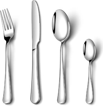 16 PIECE CUTLERY SET FOR 4: This elegant silver cutlery including 4 dinner forks, 4 dinner knives, 4 dinner spoons and 4 dessert/tea spoons for 4 people dining needs . If you are going to have a picnic or a party, then this set of tableware can not only meet your requirements, but also make your dinner full of design, perfect size suitable for any occasion.You will get many compliments