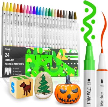 Dual Tip Acrylic Paint PensJusArt Acrylic Paint Markers feature a versatile dual tip design with a 1-5mm round tip for thick lines and a 1mm thin tip for details. Perfect for outlining and filling, these markers are ideal for artists of all levels, from beginners to professionals. The smooth-flowing ink is ready to use without pressing or shaking.(Tip: Always keep the pen capped and stored horizontally to preserve the ink quality.)