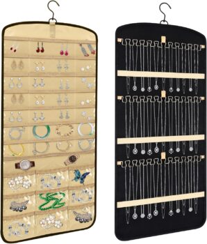 Large Hanging Jewelry Organizer Storage Roll with Hanger Metal 360Hooks Double-Sided Jewelry Holder for Earrings, Necklaces, Rings on Closet, Wall, Door, Wardrobe(Black)