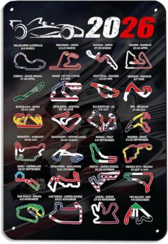 Metal Signs Vintage Wall Art Print Posters Event Calendar 2026 Racing Merchandise Plaques International Locations Track Layouts Fans Gifts for Man Cave Garage Bar, 12×8 Inch