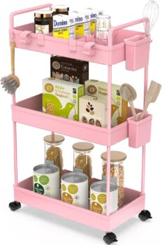 Ronlap Slim Storage Trolley, 3 Tier Rolling Cart Storage Organizer, Utility Rolling Cart with Handle Hanging Cups Dividers for Office Bathroom Kitchen Laundry Room Narrow Places, Pink