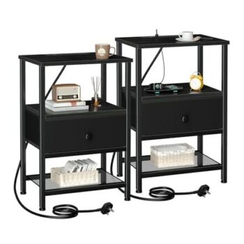 Set of 2 with Charging Station, Nightstand with Fabric Drawer