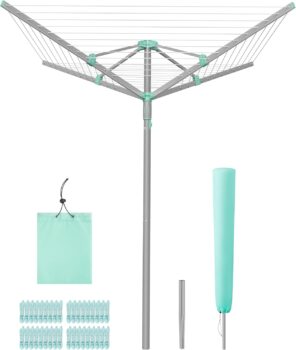 Large Drying Area: This umbrella clothesline offers 45 m of space for up to 4 loads of laundryperfect for most families. 36 clothes clips with a small storage bag secure socks and small items in place and prevent clips from getting lost