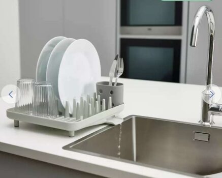 This compact dish rack features widely spaced prongs for all types of washing-up and a moveable utensil pot for draining cutlery. It has ridges and a sloping base that prevent water from being trapped inside glasses and crockery and a spout for draining directly into the sink. Non-slip feet on the base help keep the rack in place during use.