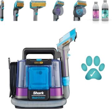 STRONG SHARK SUCTION: High-pressure spray cleans deep into fibres. Powerful suction extracts dirt & liquid for fast drying. Removes pet stains & odours, food & spills, embedded mud & dirt. Easy to clean with a built-in self-wash cycle.