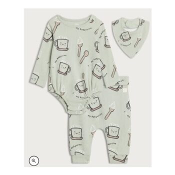 F&F 3-Piece Cotton Rich Babyccino Bodysuit, Legging & Bib Set in Green
