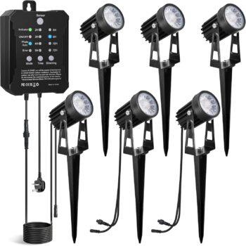 Complete Lighting Kit Includes 6 energy-efficient 3W garden spotlights mains powered, a 24W transformer with built-in photocell timer, 16.5M direct-burial landscape wire, and all necessary installation accessories. Perfect for instantly illuminating trees, pathways, gardens, and outdoor structuresno extra purchases needed. Ideal for outdoor garden lights mains powered and pathway lighting applications.