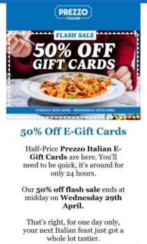Half-Price Prezzo Italian E-Gift Cards are here. Youll need to be quick, its around for only 24 hours.
