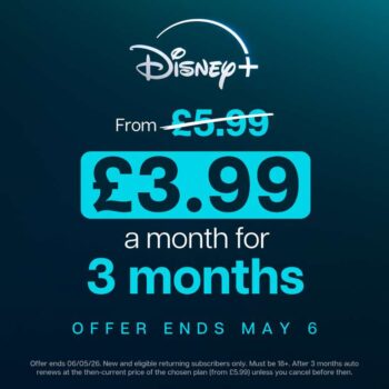 Disney from £3.99 per month for 3 months standard with ads for new and returning/lapsed subscribers. Reverts to £5.99 per month after the 3 month period unless cancelled. Offer runs until May 6th, terms listed below.