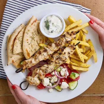 Choose any souvlaki grill with chips or rice, Greek salad, tzatziki and warm flatbread. (Any additional items from our menu can be purchased at full price.)