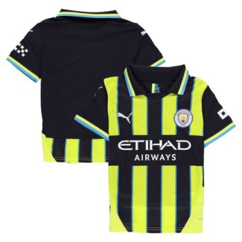 Channel the spirit of 1999 whenever youre getting behind the Cityzens with this Manchester City Away shirt from PUMA. A replica of the shirt to worn by the players on away league and cup matchdays, its navy, yellow and sky-blue trimmed design pays homage to the 25th anniversary of Citys historic Play Off final win over Gillingham at Wembley Stadium, where Messrs Dickov, Horlock and Weaver all played their part in securing promotion. A back neck sign off commemorates that most special of days, while PUMAs dryCELL technology is incorporated into the shirt, allowing you to get the same stay cool, calm and comfortable whenever you don it.