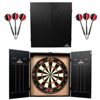 Complete dart home centre including Hot Shot dartboard, cabinet and 2 sets of darts weighing 16 grams.