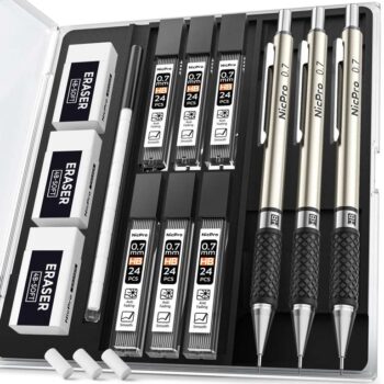 Nicpro 3PCS 0.7mm Mechanical Pencil Set with Case, RG1000 Metal Art Drafting Pencils Drawing with 6 Tube HB Lead Refills, 3 Erasers, 9 PCS Eraser Refills for Artist Writing, Engineering, Sketching