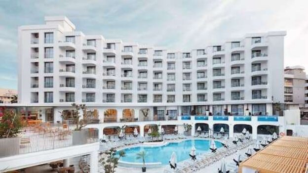 Youll love the stunning pool scene here. The main pools right in the centre of hotels gorg grounds, loungers wrap around so youll easily find a sunbathing spot, and theres a poolside bar next to it, too. When you want to dial things up, a pair of waterparks are just a 10-minute stroll away, or for some peace and quiet head to the spa. Its got a sauna, Turkish bath, steam room and an indoor pool… say less.